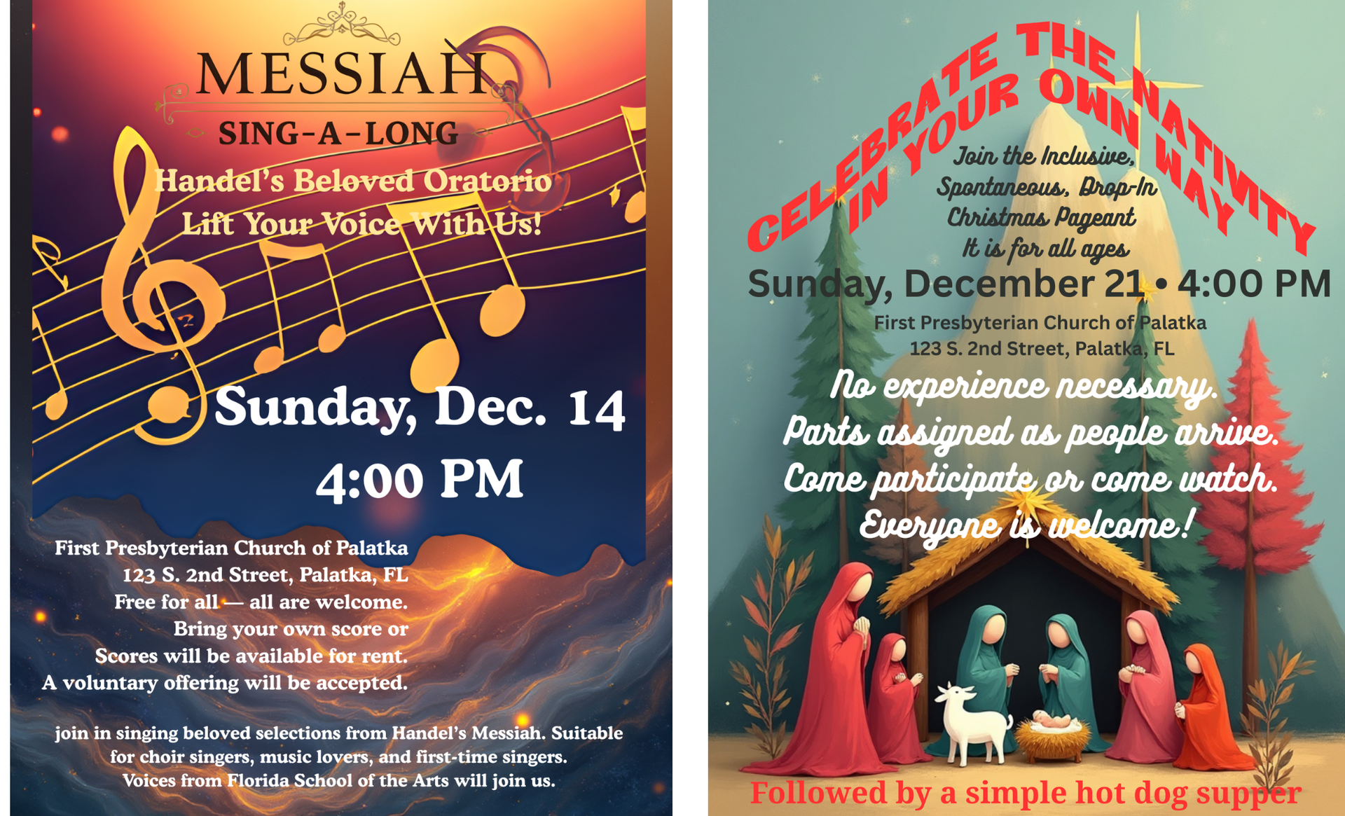 Then at 4:00 PM – Messiah Sing-A-Long – Sanctuary: Lift your voice with singers from Florida School of the Arts and our community. Whether you sing loudly, softly, or just in your heart, this beloved tradition is a joyful celebration for all.